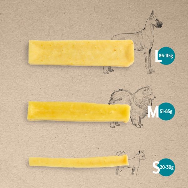 Natürliche Kaustange für zwischen den normalen Mahlzeiten und ergänzend zu einer ausgewogenen Ernährung. Nicht geeignet für Welpen unter 4 Monaten. Hunde während der Fütterung beaufsichtigen. Ca. 2-3 Käsestangen pro Woche.